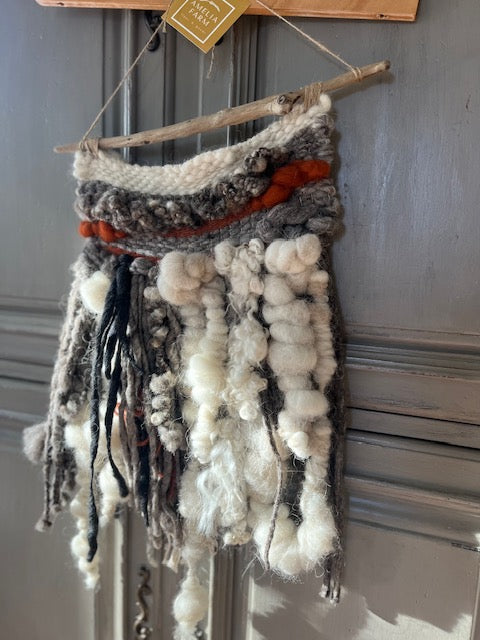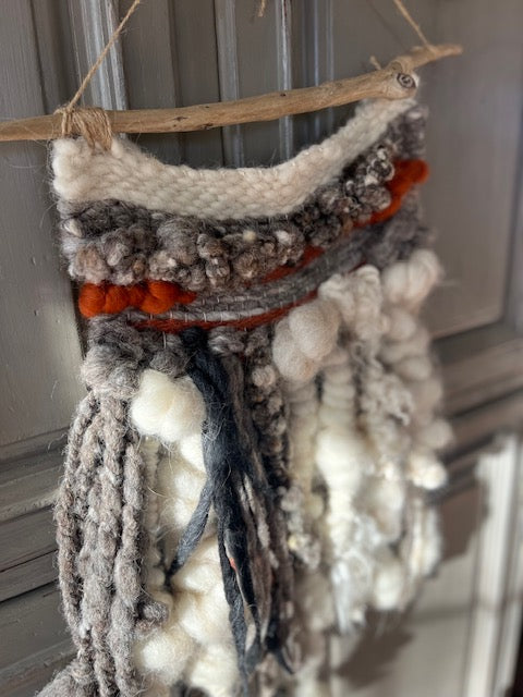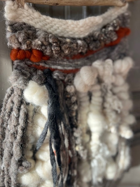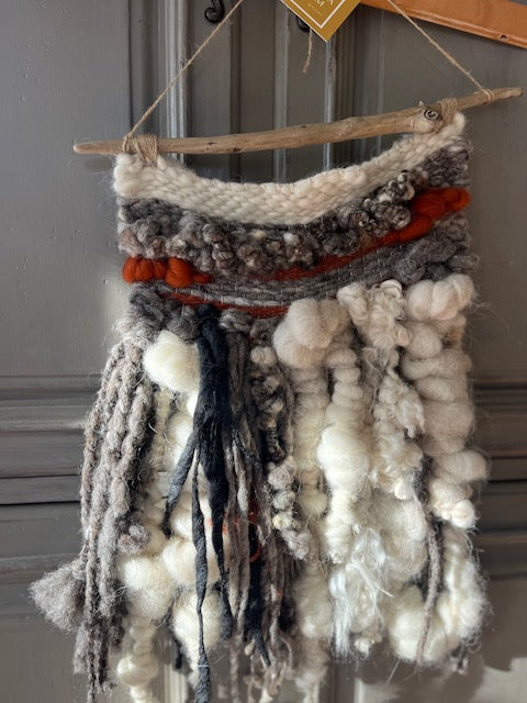 Beautiful wall weaving with hand-spun art yarn adds gorgeous texture and interest to any room. Wool is blended Jacob, NavajoChurro, Merino and Alpaca fibers and hangs on natural driftwood. Measures approximately 11"x20".