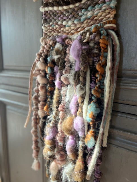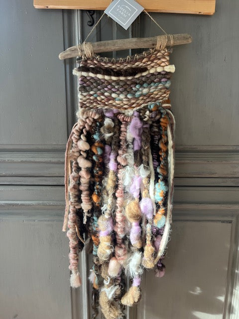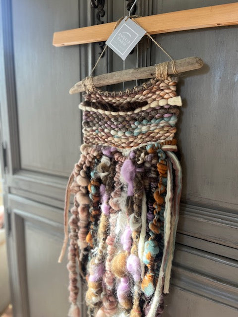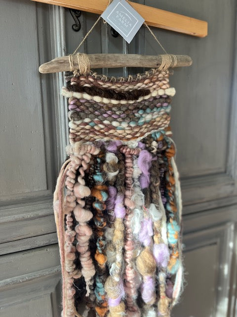 Beautiful wall weaving with hand-spun art yarn adds gorgeous texture and interest to any room. Wool is blended Jacob, NavajoChurro, Merino and Alpaca fibers and hangs on natural driftwood. Measures approximately 9"x26".