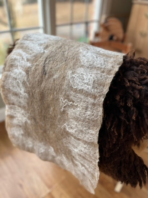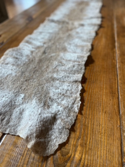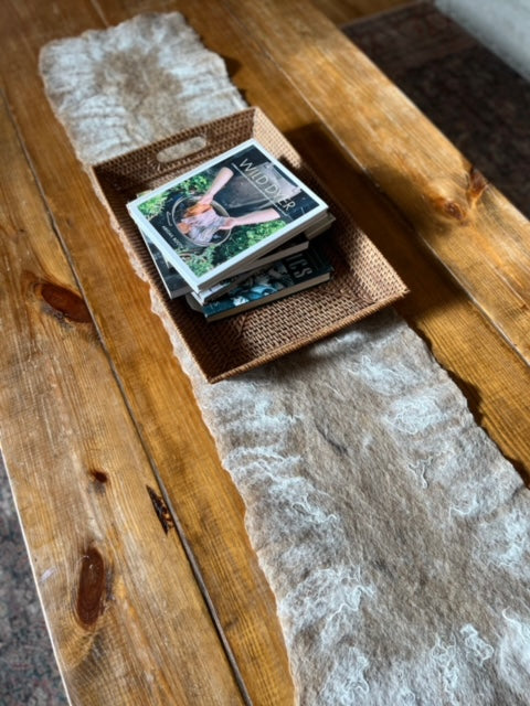 All-natural art for the collected home. This hand-made felted wool runner was artistically made using natural sheep wool and alpaca fibers from our farm.