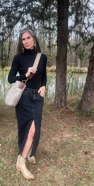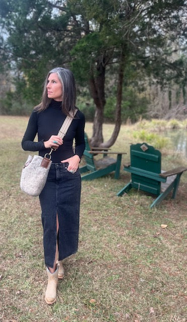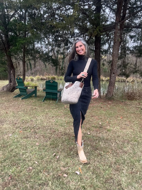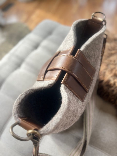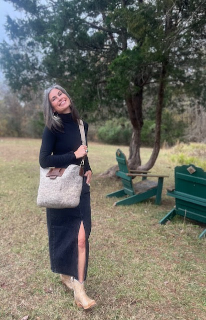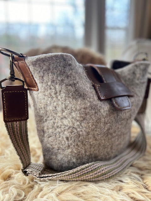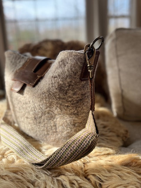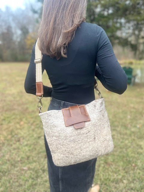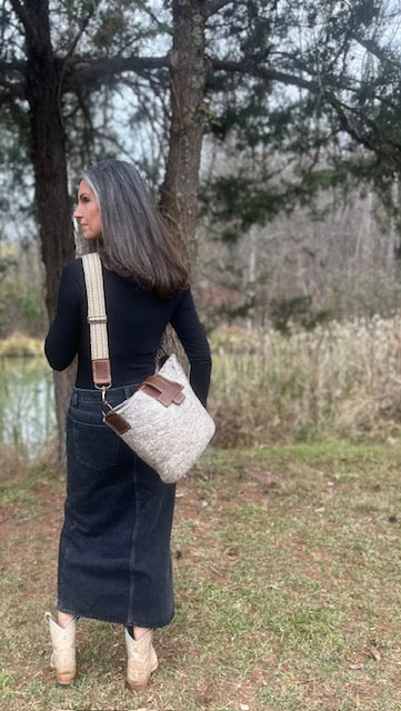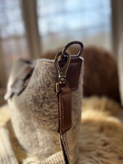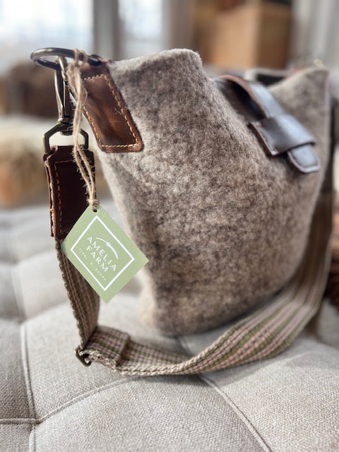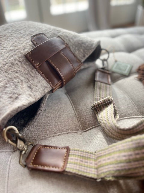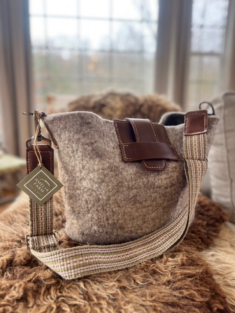 Handmade by me with wool from our family farm, this one-of-a-kind bag is made with a blend of alpaca and wool fibers, and beautiful genuine leather. I design and weave the cotton strap and use high-quality antique brass hardware for lifelong durability. This bag will only get better with age. The fastening closure is also a signature Amelia Farm design. With no metal buckle or magnet, it's thoughtfully constructed with a sleek design to ensure your belongings stay secure all day.