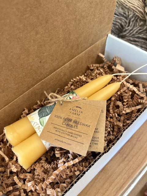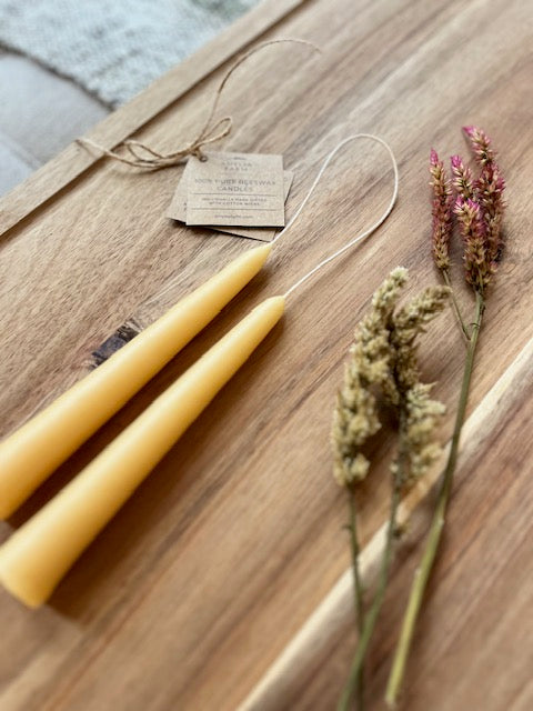 Our hand-dipped natural beeswax taper candles create the most cozy ambience and smell of warm honey without any need for added fragrances. They burn slowly and steadily, making them a welcome addition to your table, mantelpiece, or anywhere that could benefit from a warm glow.