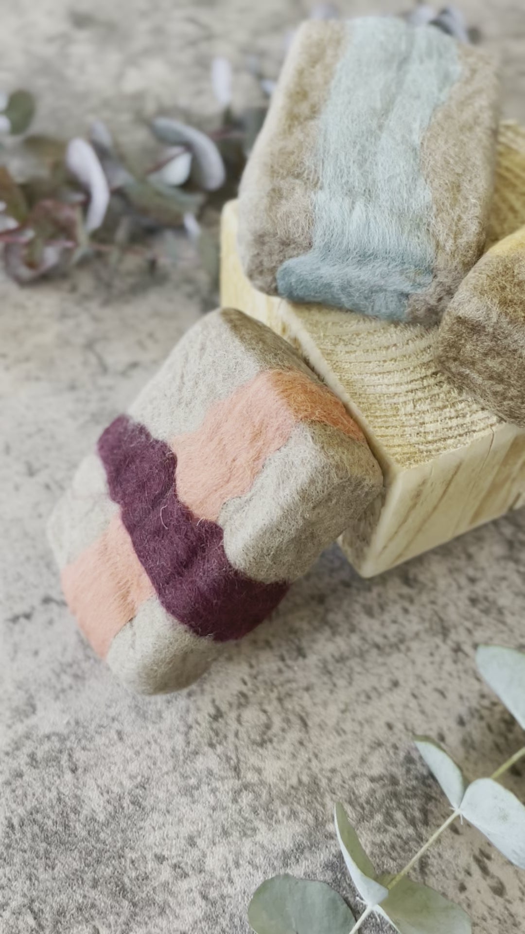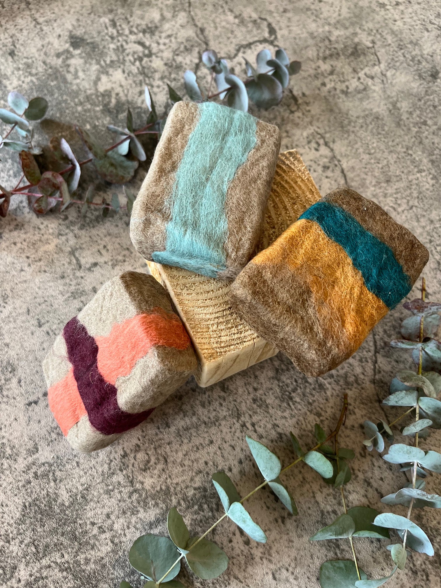 These beautiful soaps are handmade with the heritage sheep wool and alpaca fibers from our farm. They are a soap + wool washcloth/loofa in one. Handmade, natural soaps from 100% vegetable oil base and real essential oils are individually felted to create a unique design.