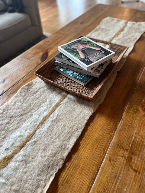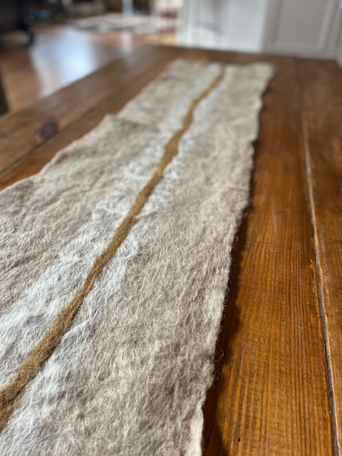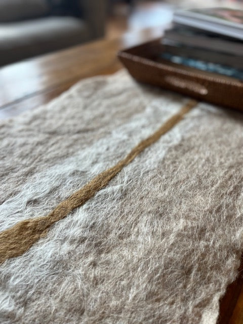 All-natural art for the collected home. This hand-made felted wool runner was artistically made using natural sheep wool and alpaca fibers from our farm.