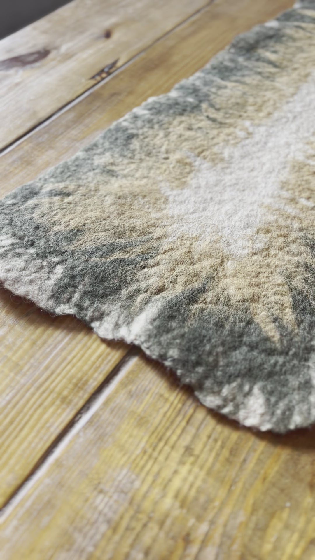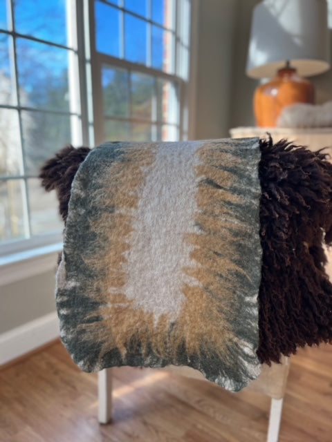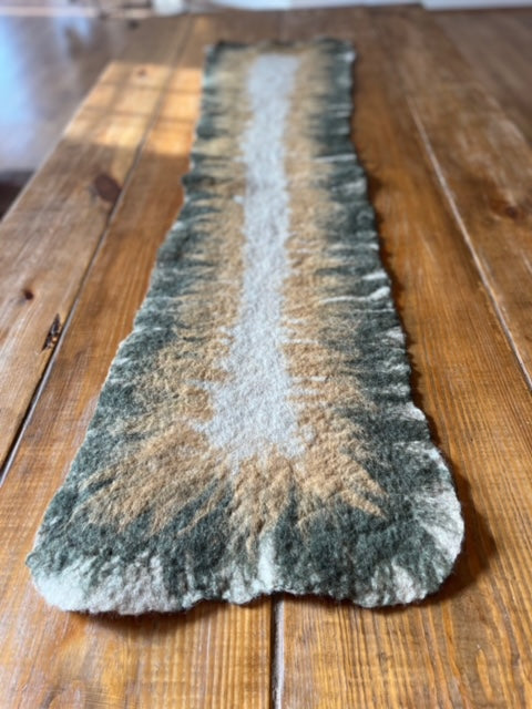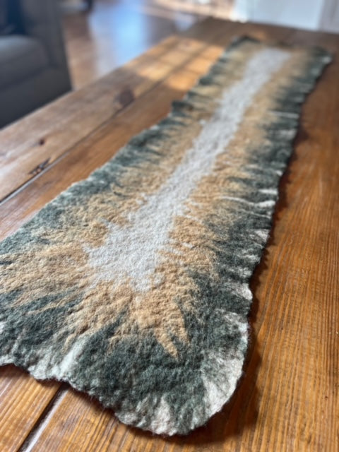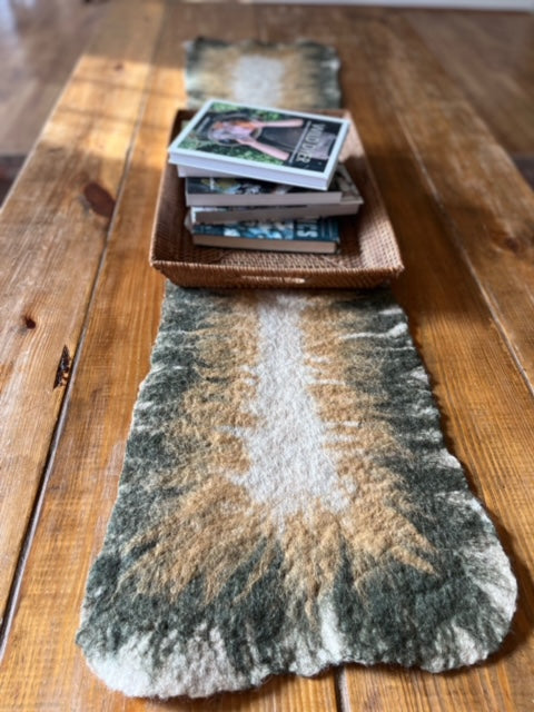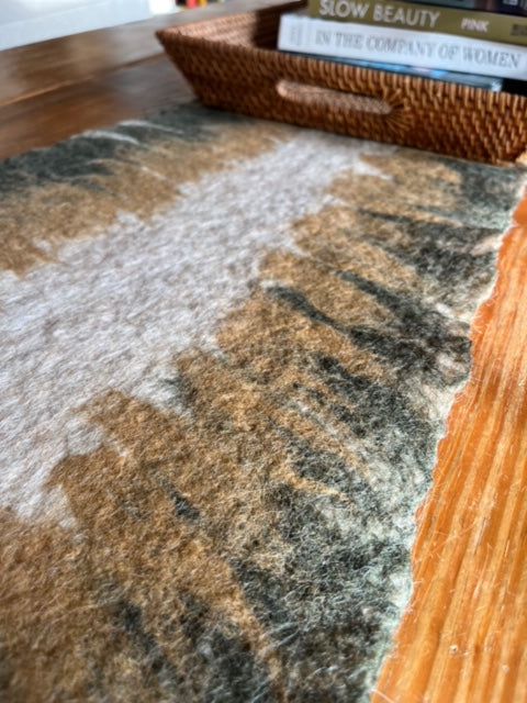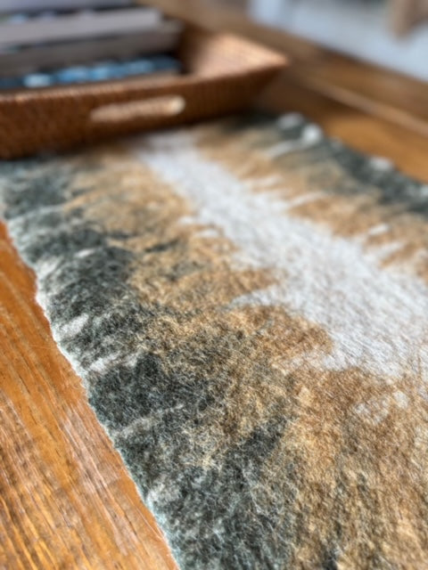 All-natural art for the collected home. This hand-made felted wool runner was artistically made using natural sheep wool and alpaca fibers from our farm.