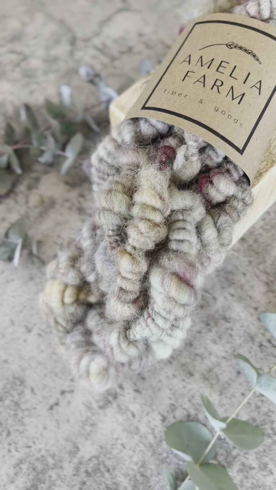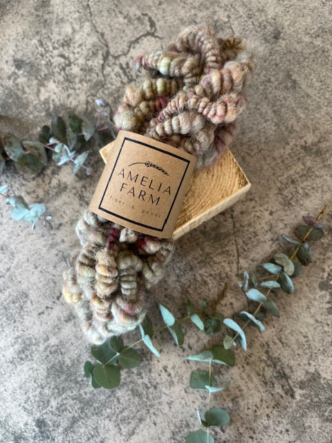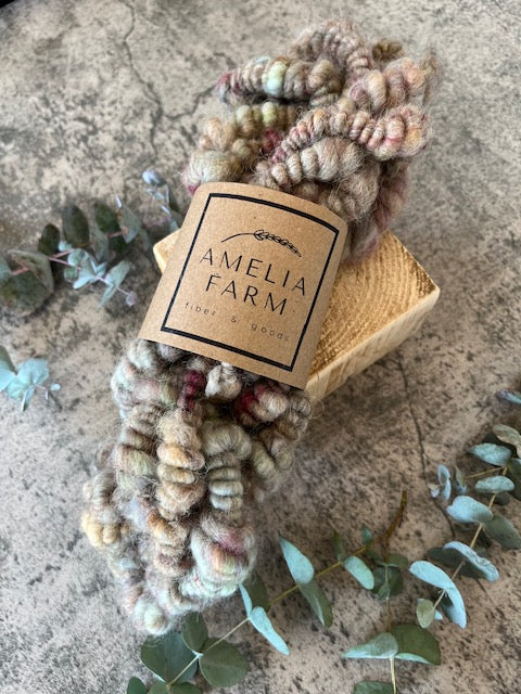 This art yarn, totaling 3 yds., is mixed with Jacob and Alpaca fibers. They are perfect to add texture to your weavings or just to string in your home for a fun accent.
