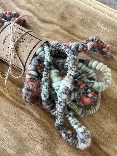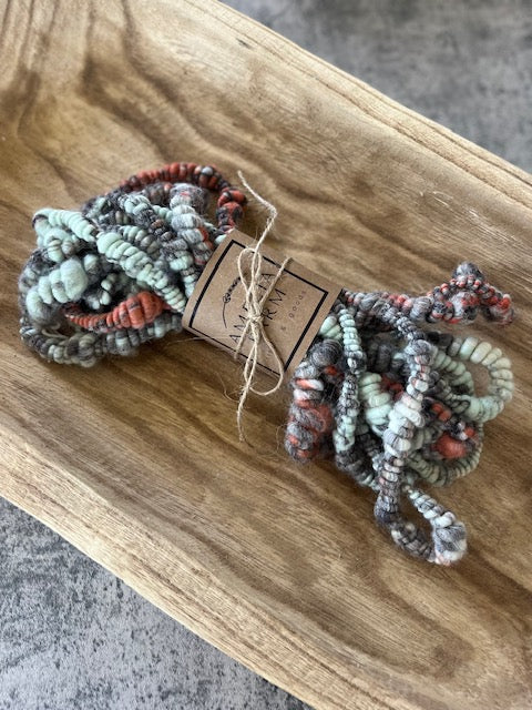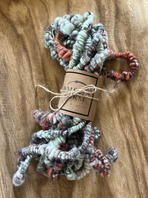 This art yarn, totaling 5 yds., is mixed with Jacob and Alpaca fibers. They are perfect to add texture to your weavings or just to string in your home for a fun accent.