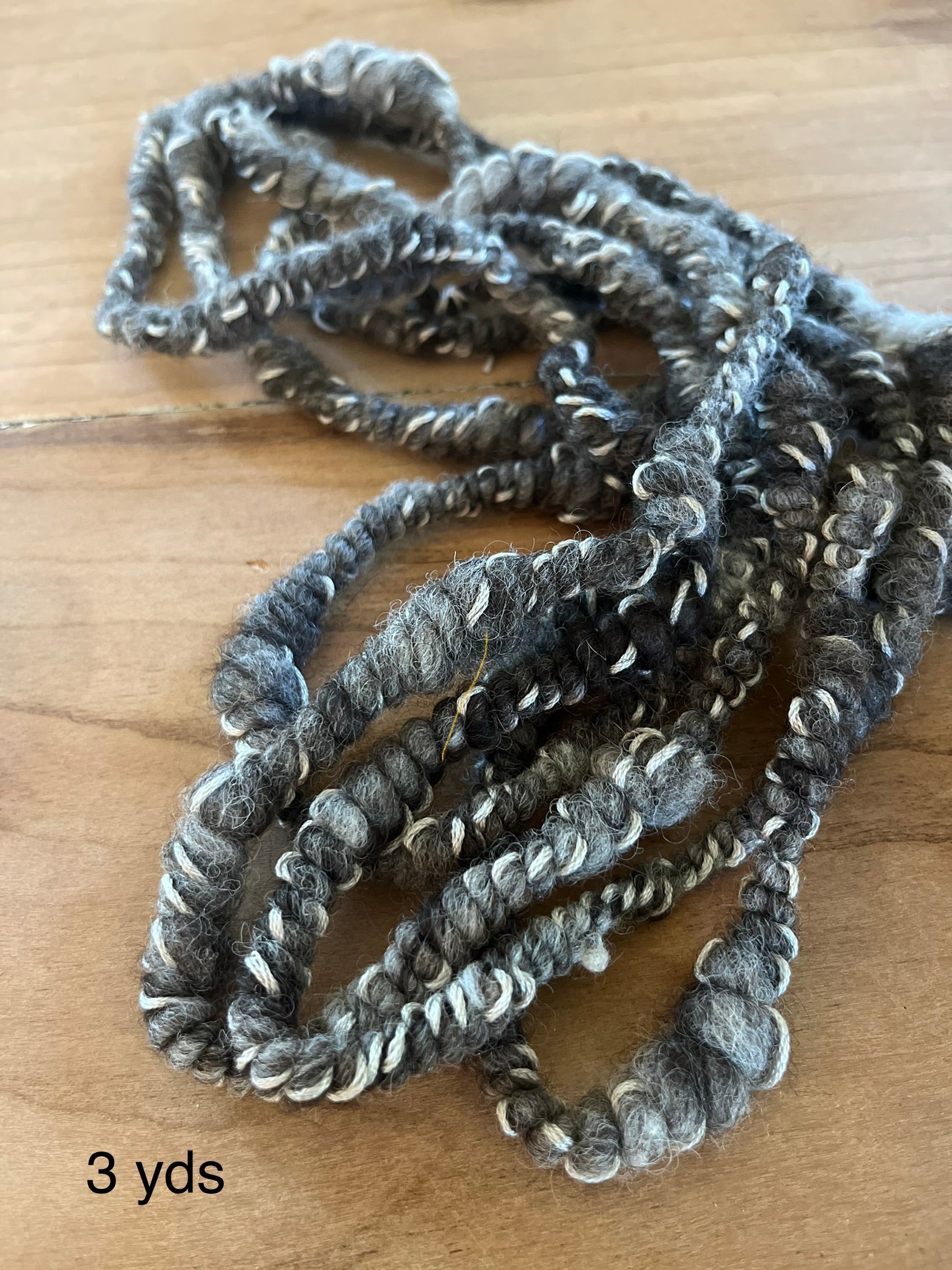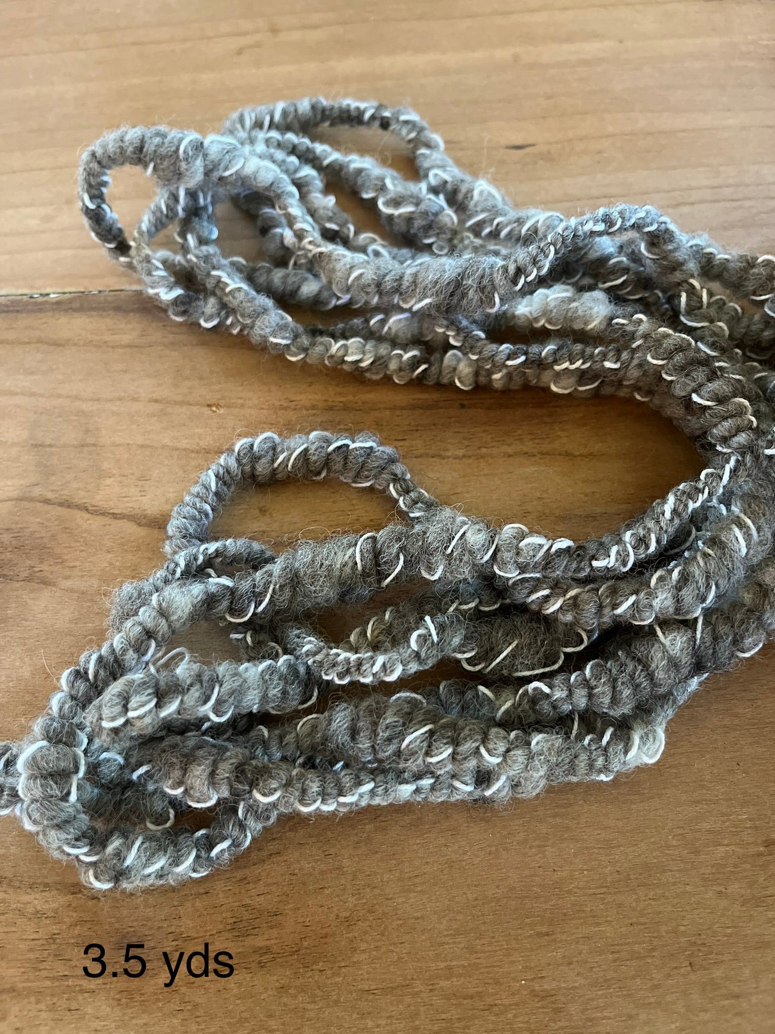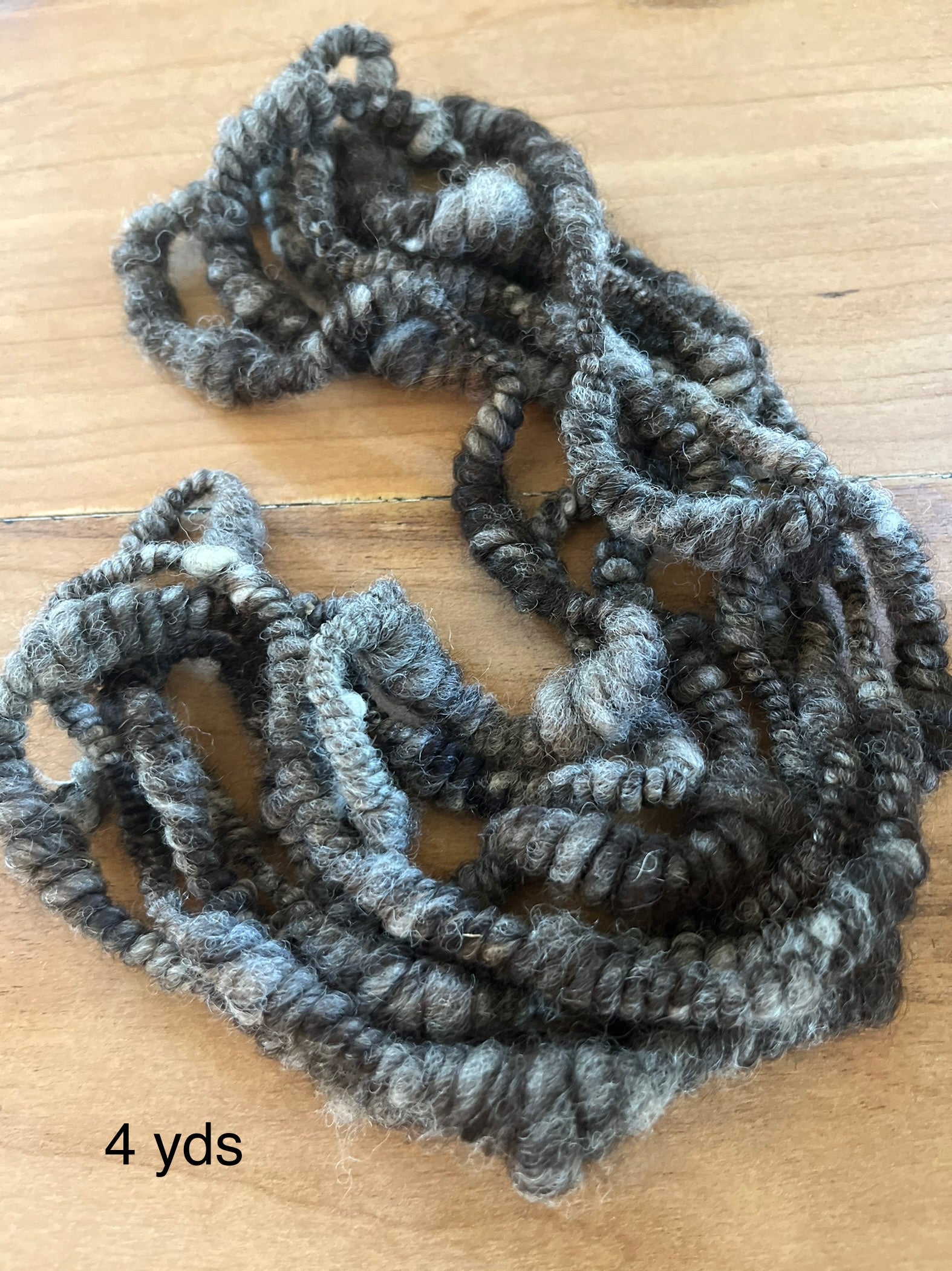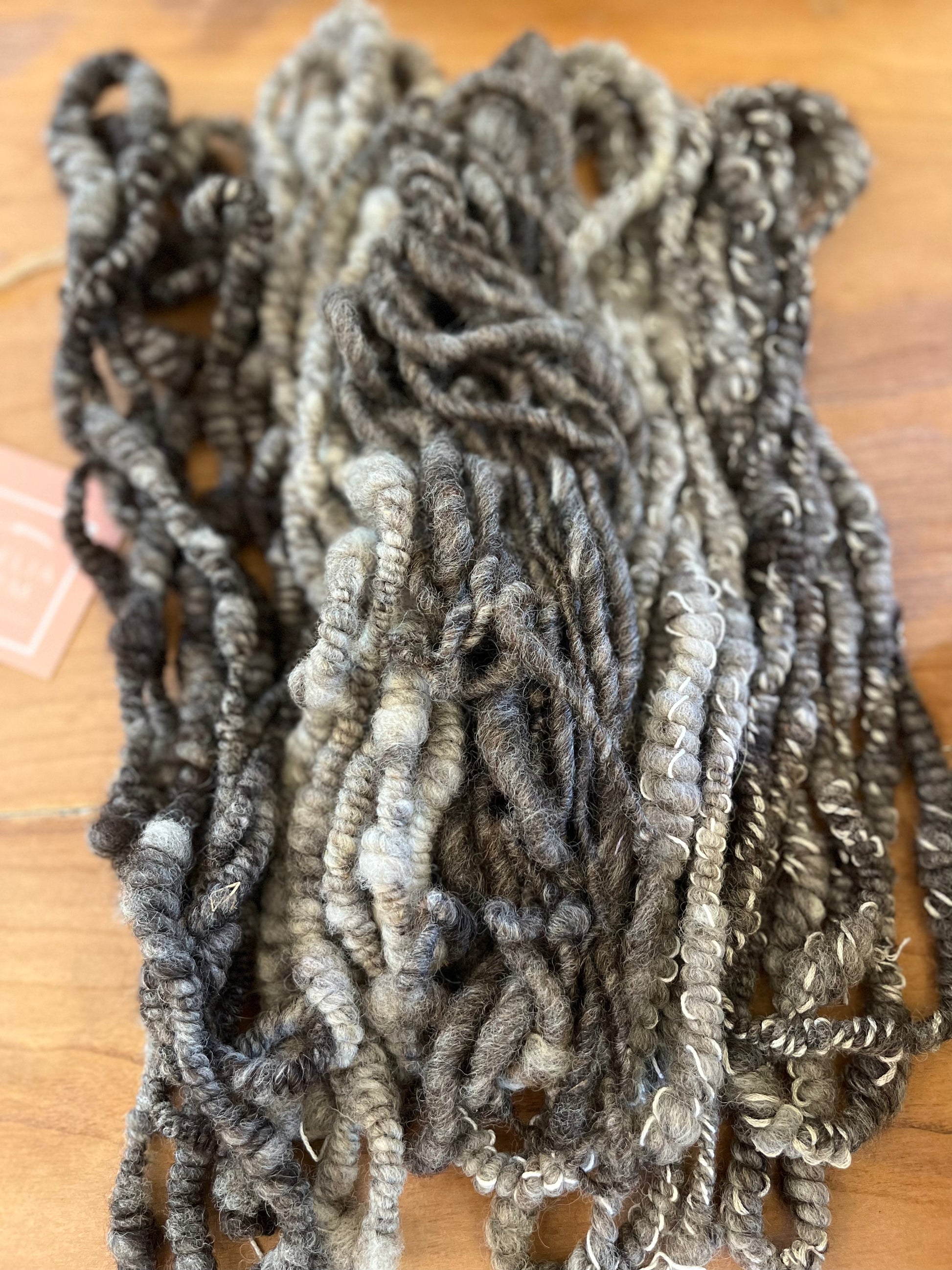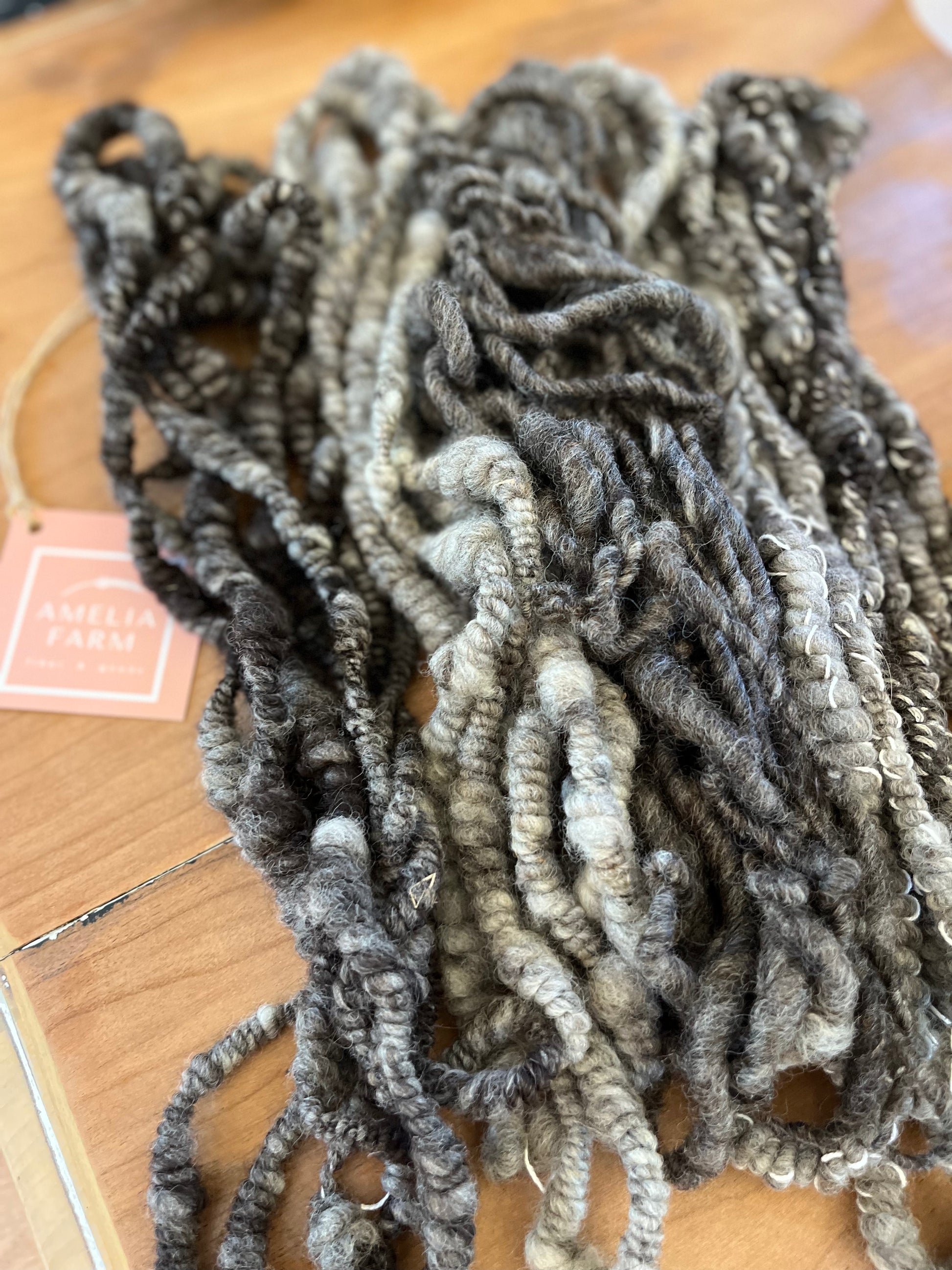 You will receive the collection of yarns shown in the listing. This collection of art yarns, totaling 22 1/3 yds. (5.7oz), is mixed with Jacob and Alpaca fibers. They are perfect to add texture to your weavings or just to string in your home for a fun accent.