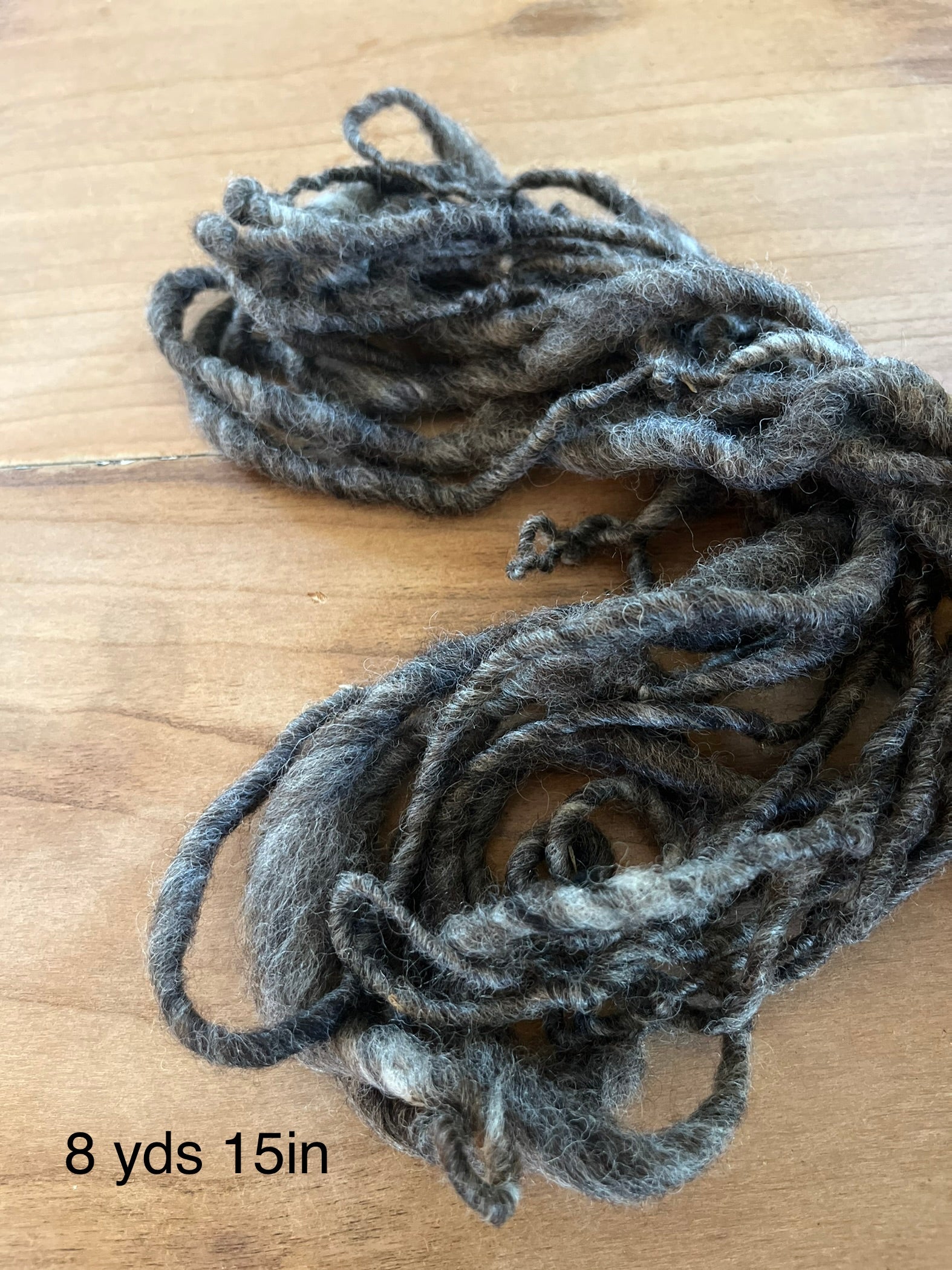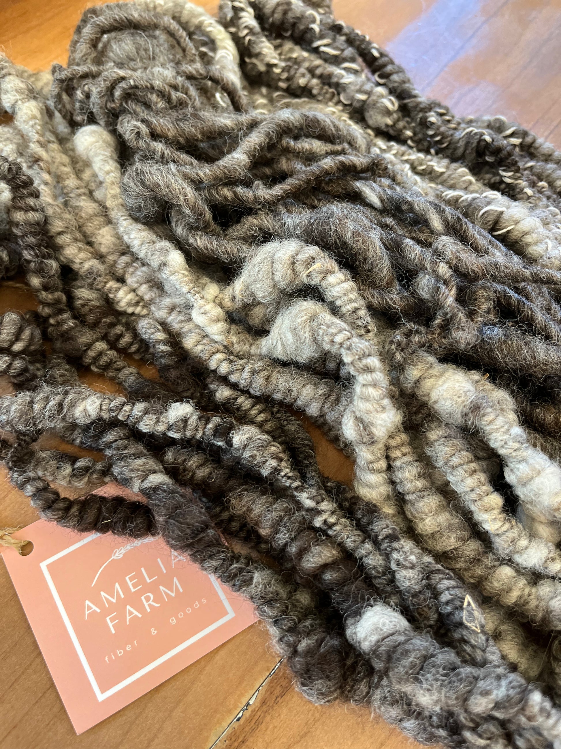 One-of-a-kind art yarn hand spun on the drop spindle. Each fiber is lovingly hand washed, carded, and hand spun by me. Our beautiful sheep and alpaca provide us the most gorgeous fibers. Happy sheep and alpaca grow beautiful fiber.