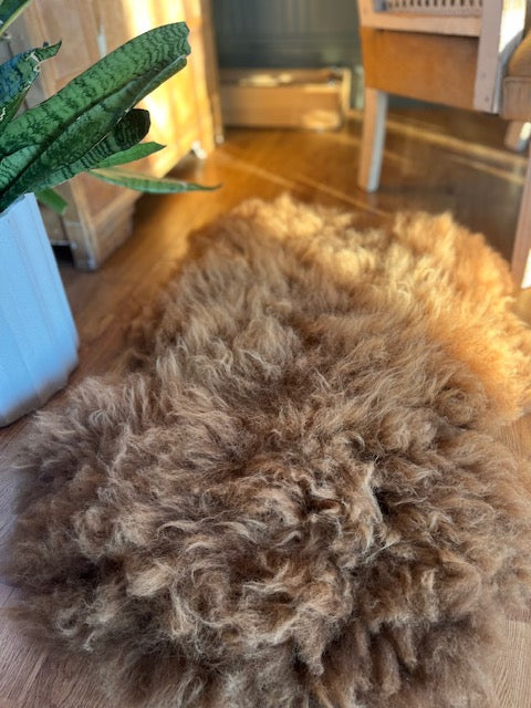 The coziest organic sheepskins for your sustainable home. My naturally tanned sheepskins are the most incredibly soft, natural material you can imagine. The skins are naturally tanned by me to produce a dreamily soft, luxurious sheepskin rug. The one shown here is a NavajoChurro/Jacob breed.