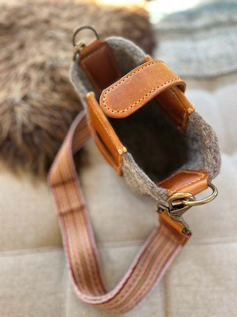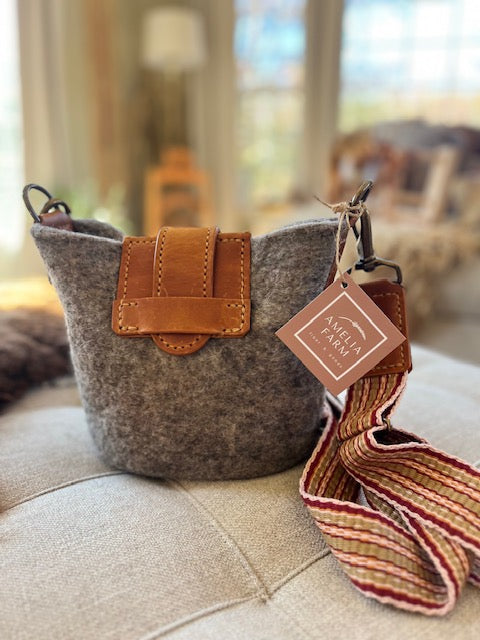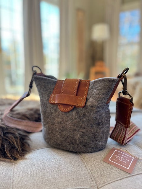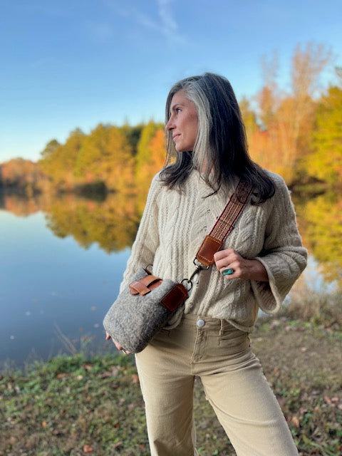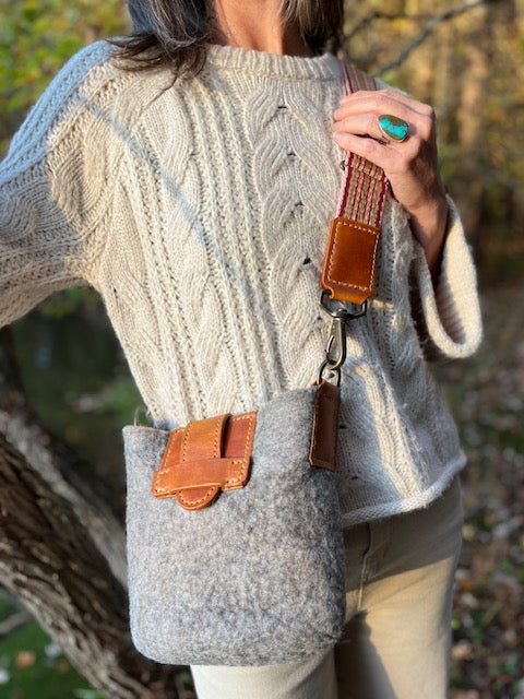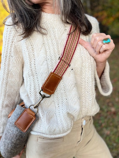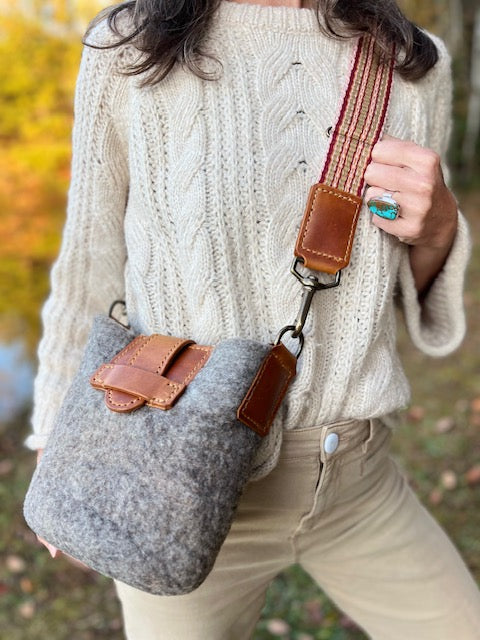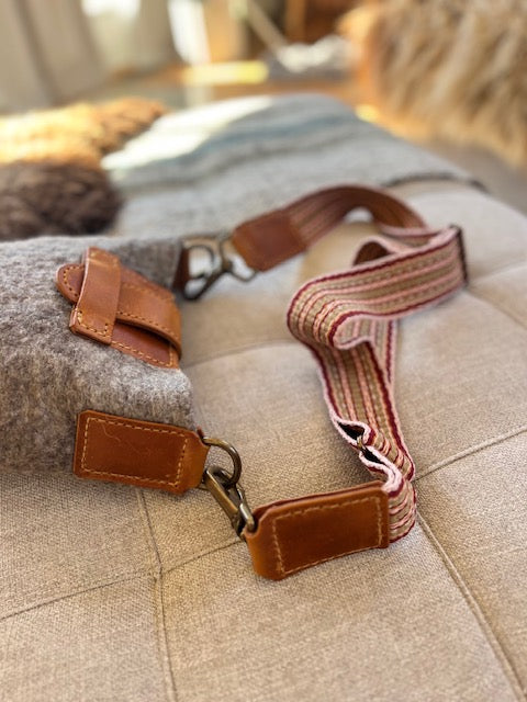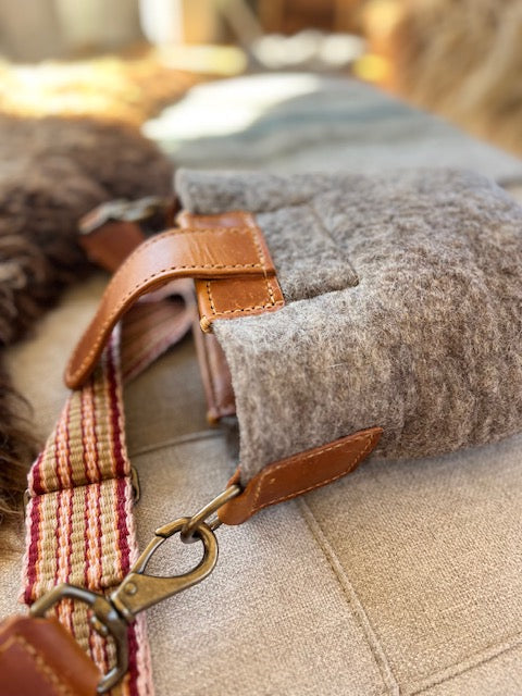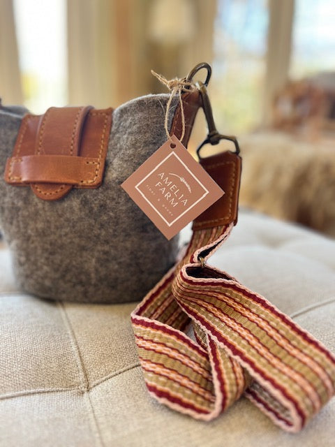 Handmade by me with wool from our family farm, this one-of-a-kind bag is made with a blend of alpaca and wool fibers, and the best quality full-grain leather. I design and weave the 2" cotton strap and use high-quality antique brass hardware for lifelong durability. This bag will only get better with age.