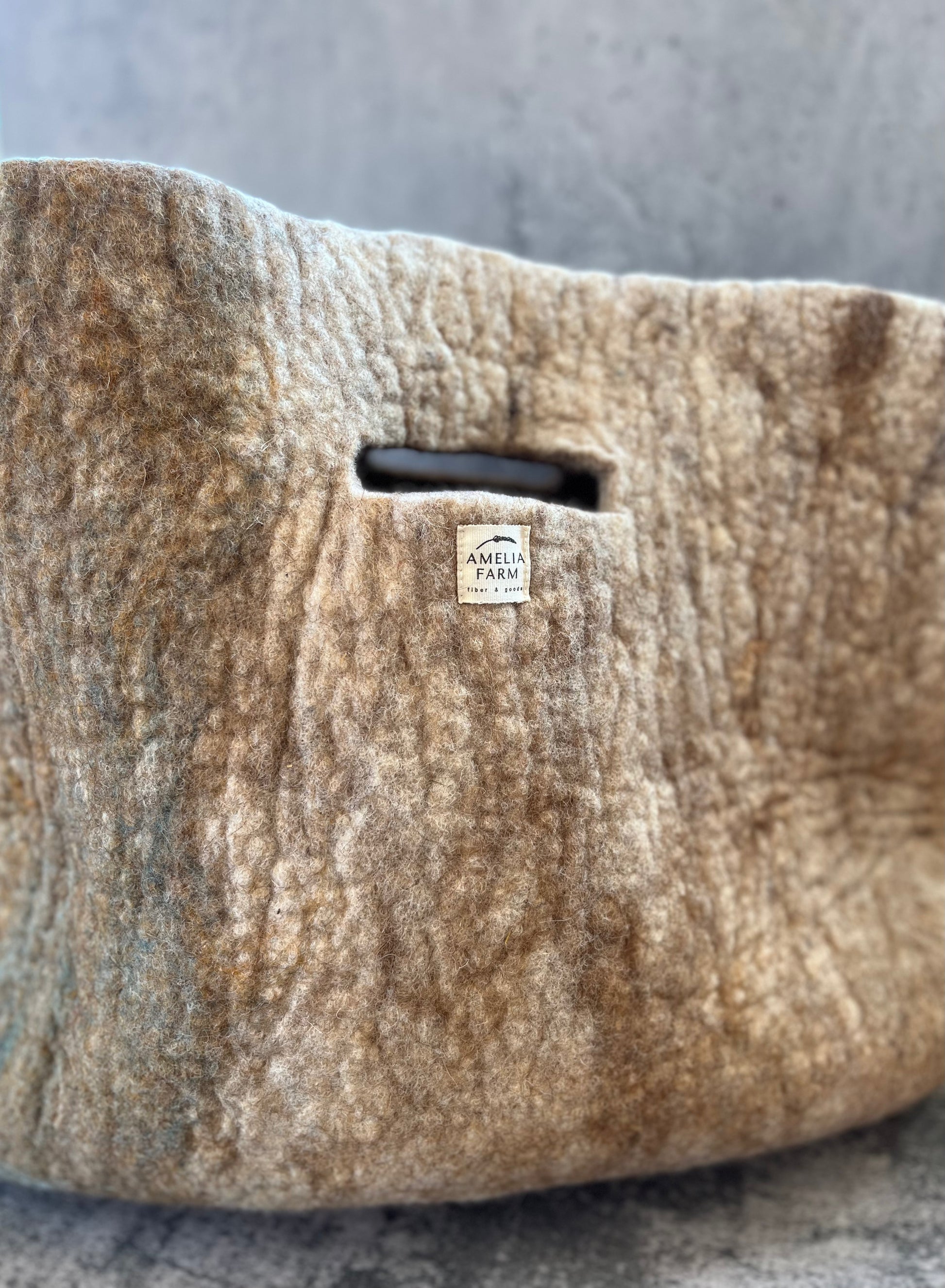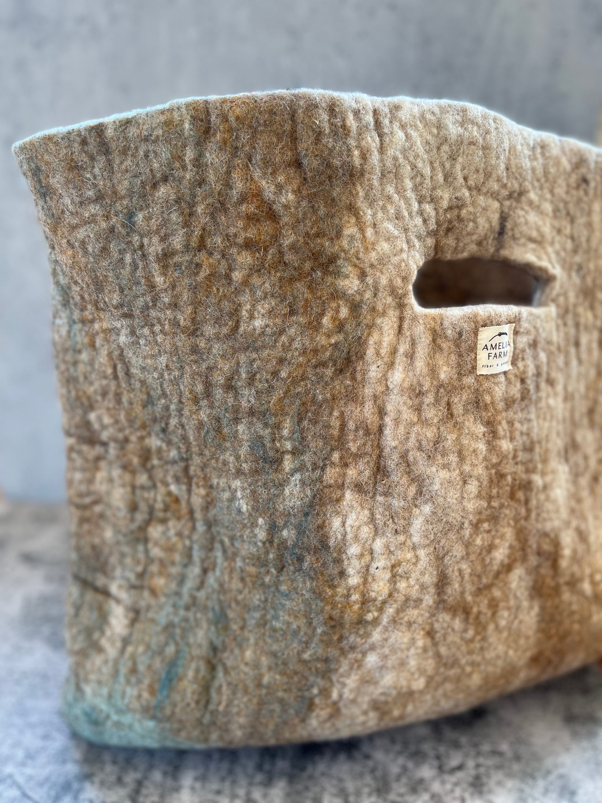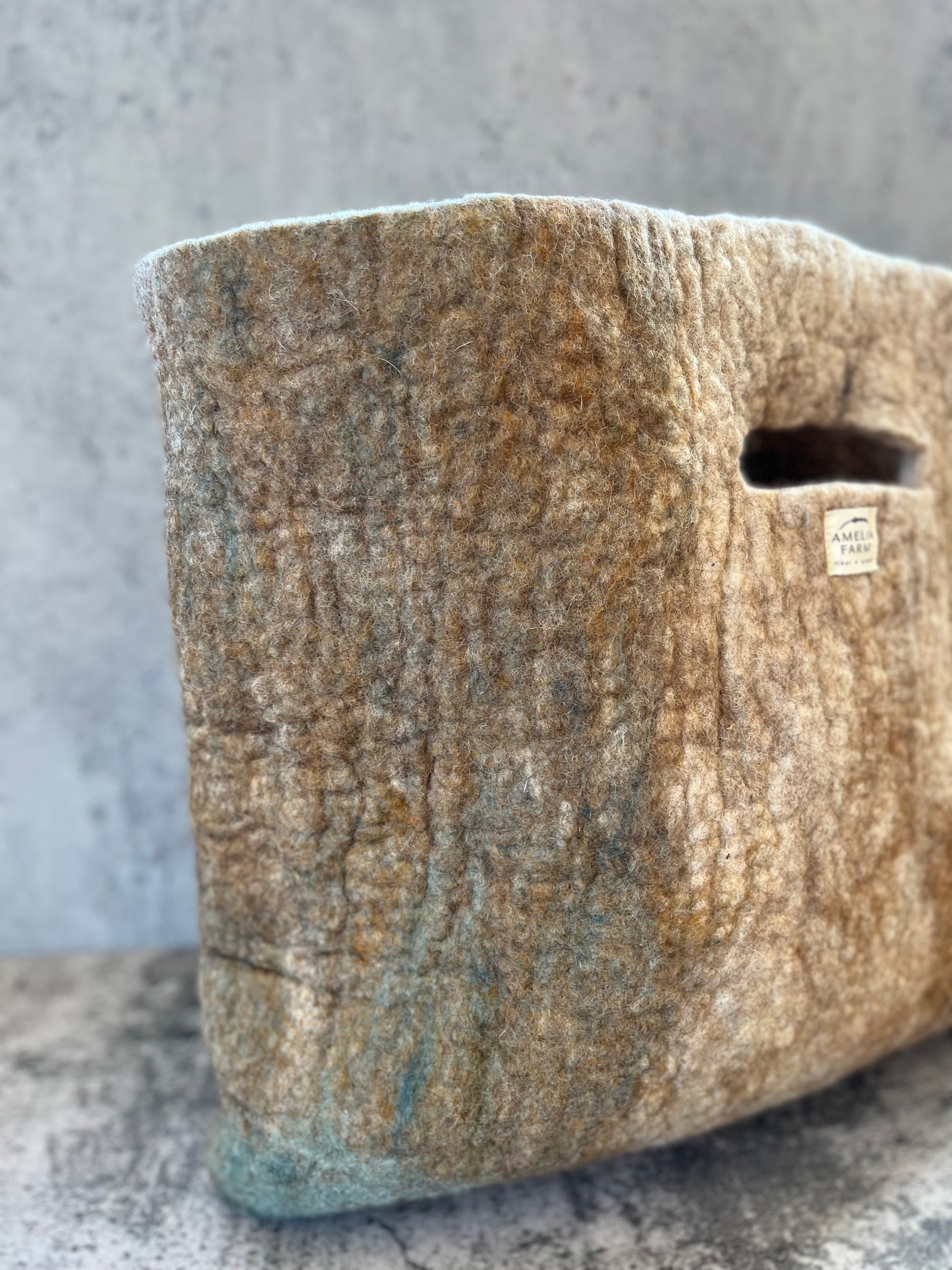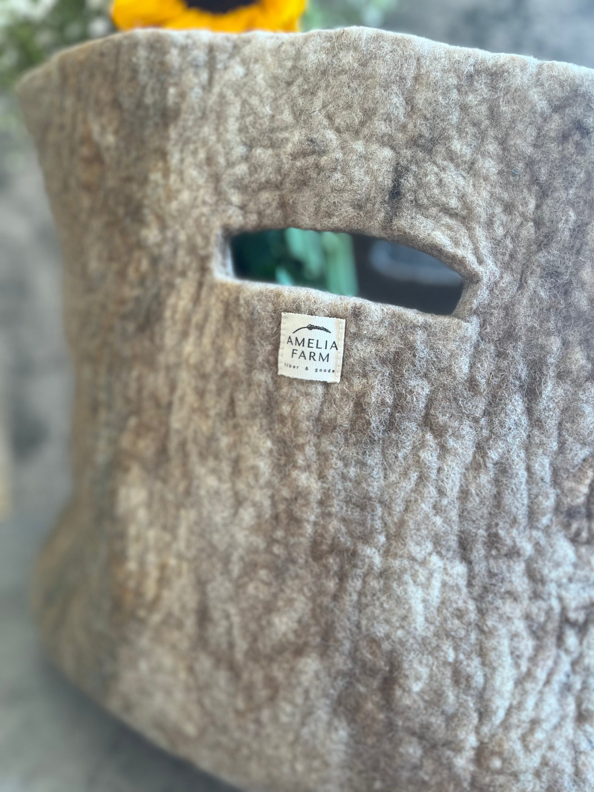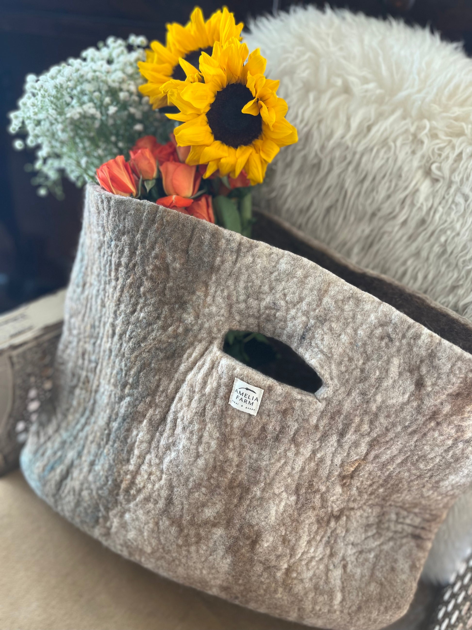 Beautifully handcrafted felted wool handbag...This bag will become your favorite carryall. It's thick and sturdy. Handmade with wool from our family farm, this one-of-a-kind market bag is made with a blend of alpaca and wool fibers.
